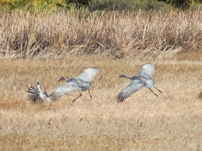 | This was truly a sight. The cranes are arriving for feeding before going to roost for the night. Their distinctive calls and slow descent as they circle a landing area is very memorable. |